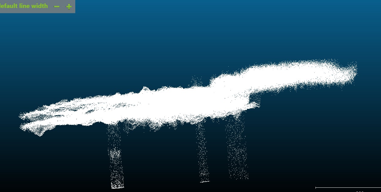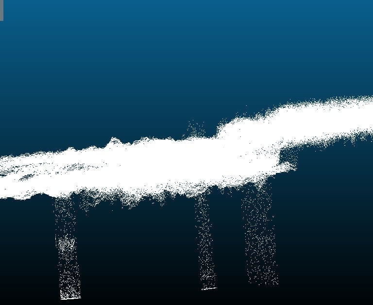 Escaneo LiDAR tridimensional del Lago de Moka, Bioko, Guinea Ecuatorial. La nube de puntos muestra la superficie lacustre como una estructura horizontal densa, con textura irregular producto de la dispersión del láser en el agua. Desde el plano principal emergen tres columnas verticales de puntos, interpretadas como cavidades subacuáticas de origen volcánico. Estas cavidades sugieren la existencia de manantiales o galerías internas que alimentan el lago, cada una con corrientes diferenciadas capaces de generar turbulencias invisibles en la superficie. La disposición repetida y consistente de estas cavidades refuerza la hipótesis hidrogeológica de entradas subterráneas de agua, cuya dinámica puede explicar fenómenos de succión y desapariciones documentadas en la zona.